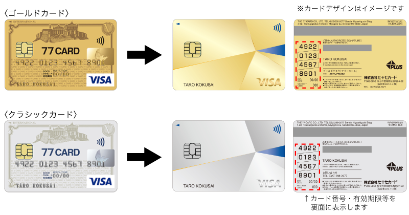 七十七カードは、安心・安全にクレジットカードをご利用いただけるよう、Visa/Masterカードのデザインをリニューアルいたしました。カード番号等お客様の大切な情報を裏面へ集約し、セキュリティを強化していますので、より便利で安全になった新しい七十七カードを是非ご利用ください。